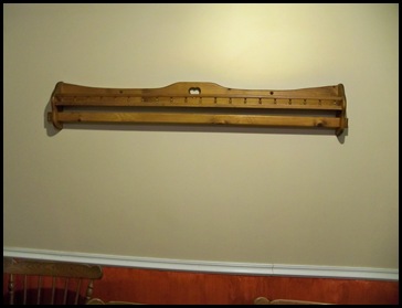 First, I have a long wall in my “dining area”. We are living in our basement and our living and dining areas are one large “room”. There has been a quilt rack (with one of those awful heart cut-outs in it) hanging there for the whole 10 years we’ve been living here. I’ve been out of love or even like with it for years, but it never occurred to me that I could take it down! Silly huh?